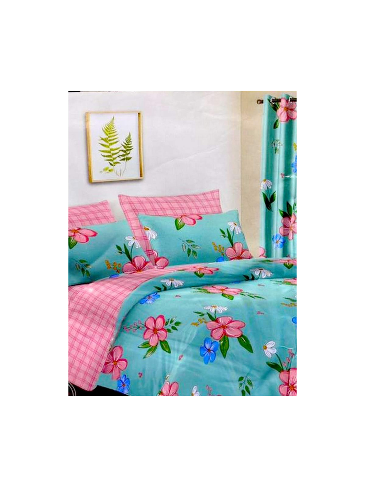 Set 02 Three-Seater Bed Sheets, 02 Pillowcases and 02 Cotton Curtains in Sky Blue and Pink Floral Color
