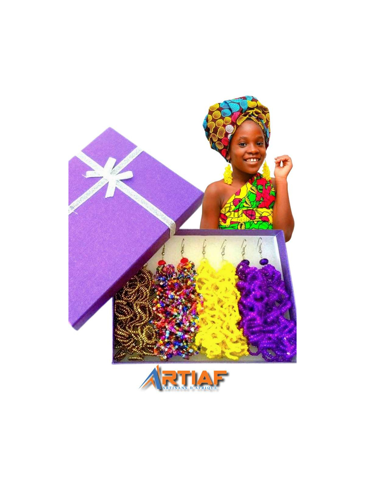Coffret de boucles d'oreilles africaines en perles pour femmes fabriqué par Bilitis Fashion à Lomé au Togo. De couleurs multiples, élégantes et raffinées, ces boucles de grande qualité se portent à de nombreuses occasions. En ce moment, elles font le buzz dans plusieurs pays en Afrique.