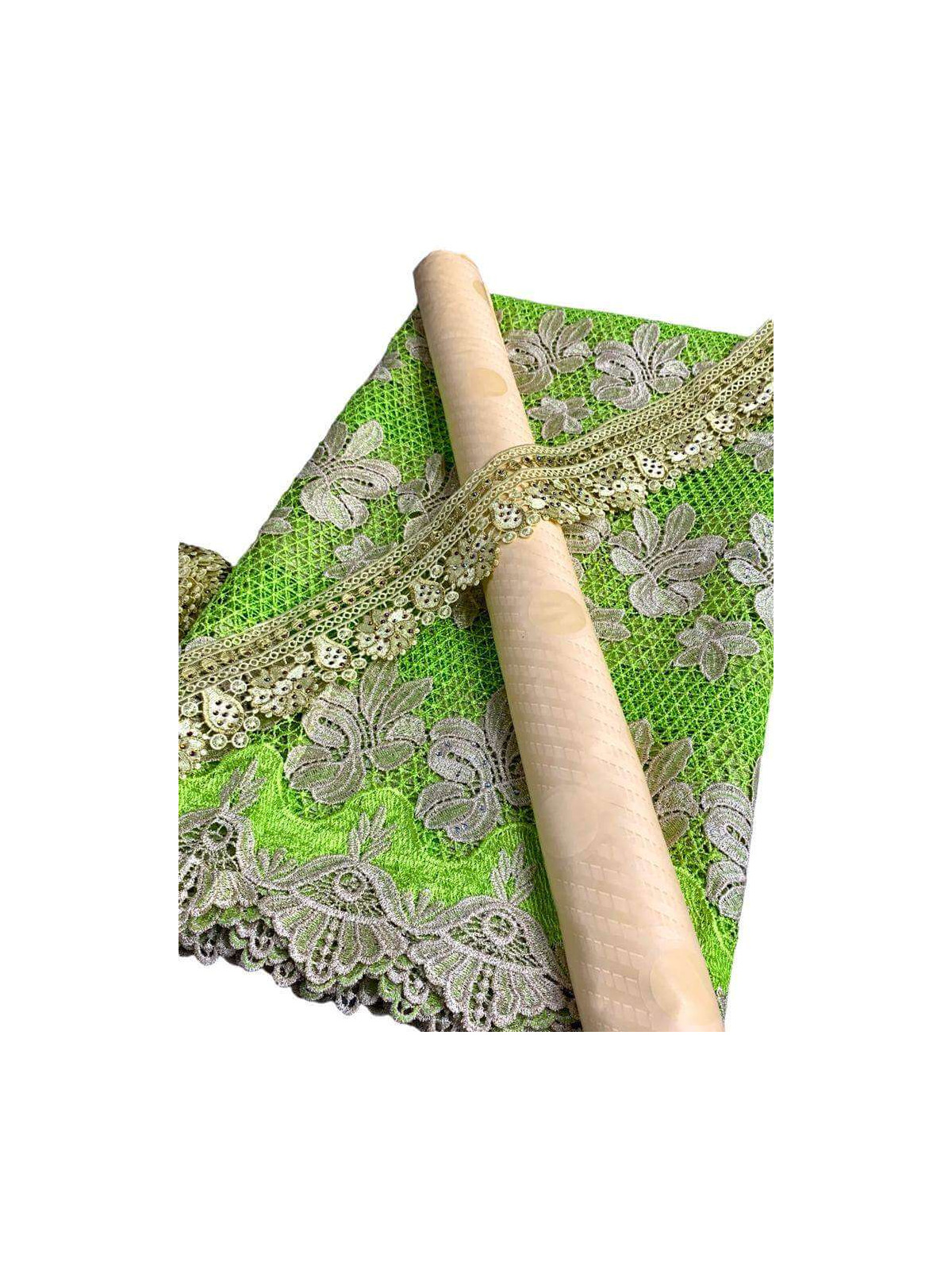 Tissu Bazin riche 100% coton composé d'une pièce de Bazin motif unique 2 m, Dentelle 4 m et Garniture pour vêtements homme, femme et enfant. Motifs verts et gris