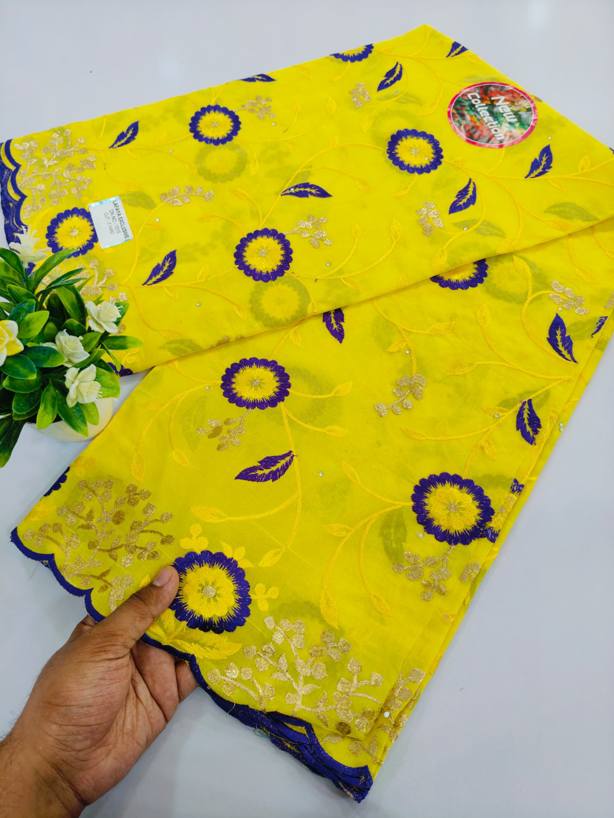 Tissu africain "Lafaya Lace" fabriqué à Dubaï. De haute qualité, ce tissu est fait de dentelles en coton brodées avec voile. Ce tissu est parfait pour créer vos propres modèles de robes, tailleurs et autres accessoires pour mettre en avant la mode africaine. 100% Coton, il a 5.48 mètres de taille.