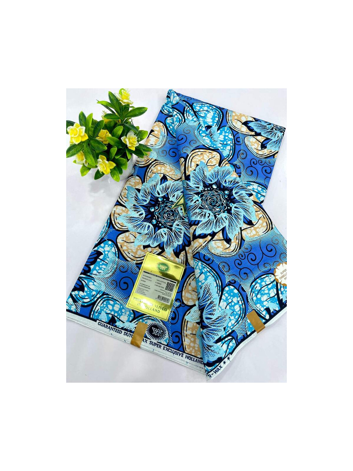 Fabriqué à partir de coton, le tissu Vlisco Gold Wax est un tissu de haute qualité. Ce tissu unique est parfaits pour créer votre propre mode! Aussi connu sous le nom de tissu wax hollandais ou de tissu Kitenge, le Super Vlisco Gold Wax est 100% coton et original. Son design éclatant et distinctif est parfait pour la confection de vêtements hauts de gamme.